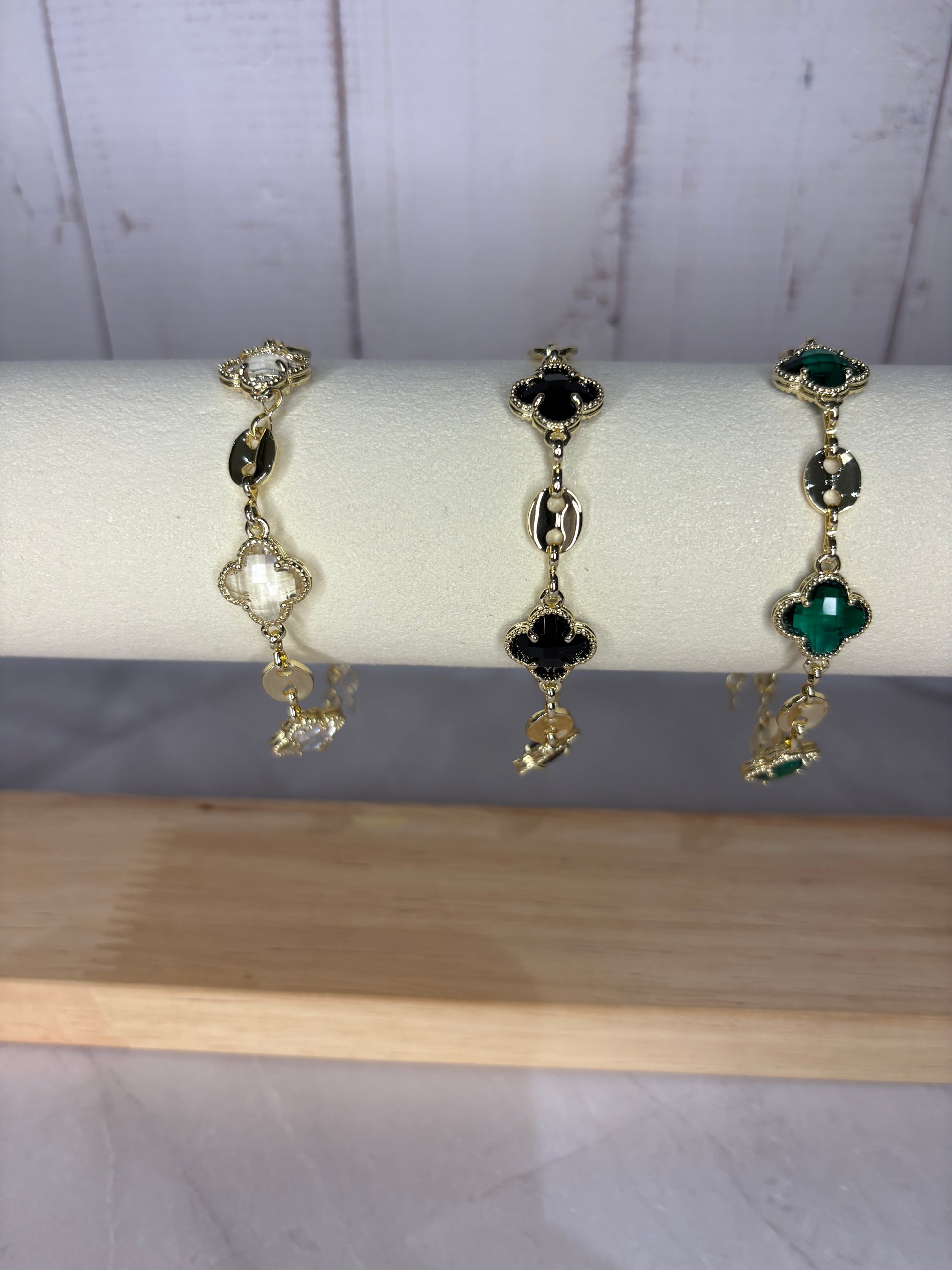Add a touch of elegance and sparkle to your wrist with this stunning crystal clover bracelet. Featuring high-quality crystal clover charms that catch the light beautifully, this piece is crafted with a durable base and finished in luxurious 14K gold plating. Perfect for stacking or wearing on its own, it’s a timeless statement of charm and shine.