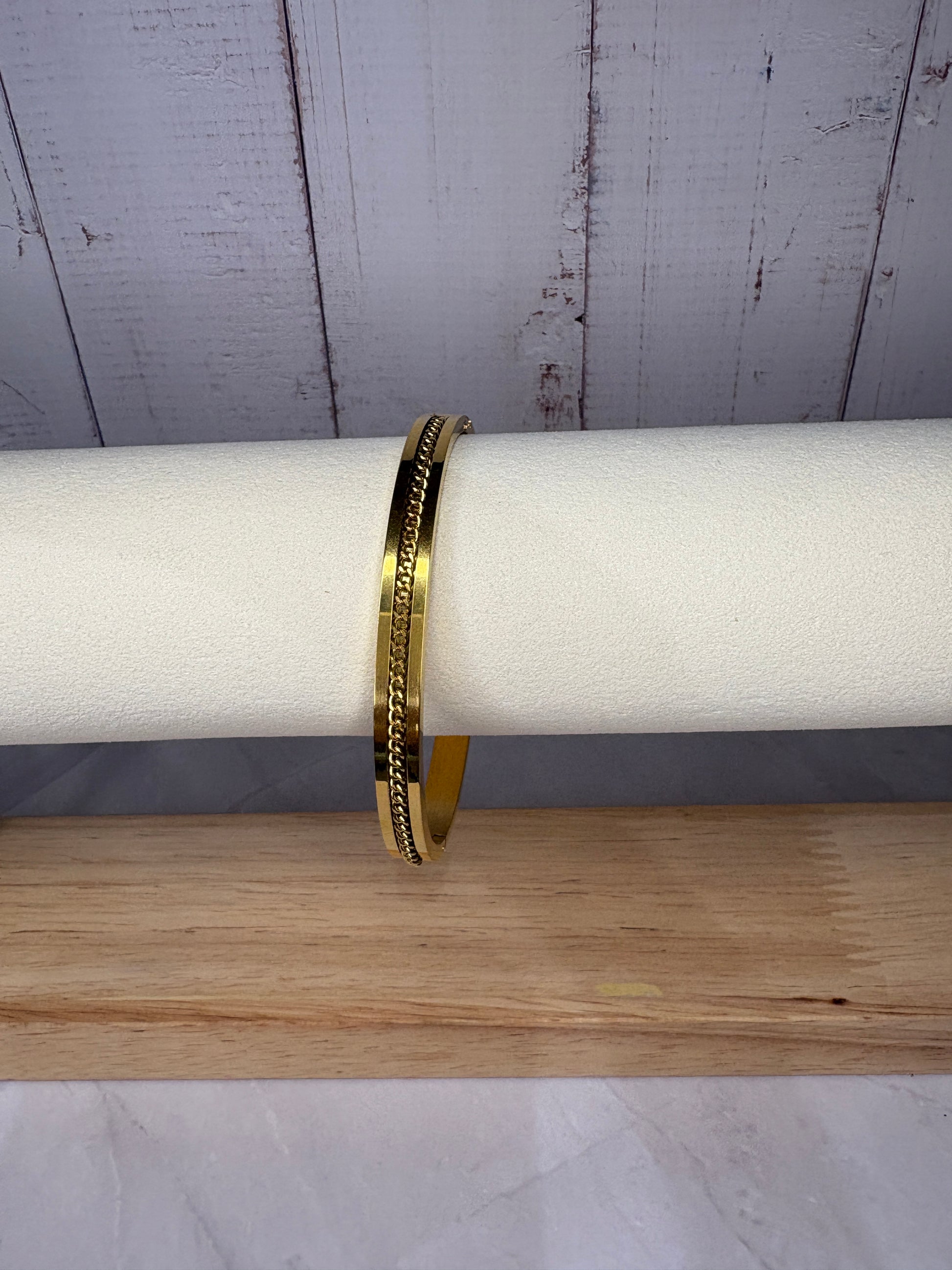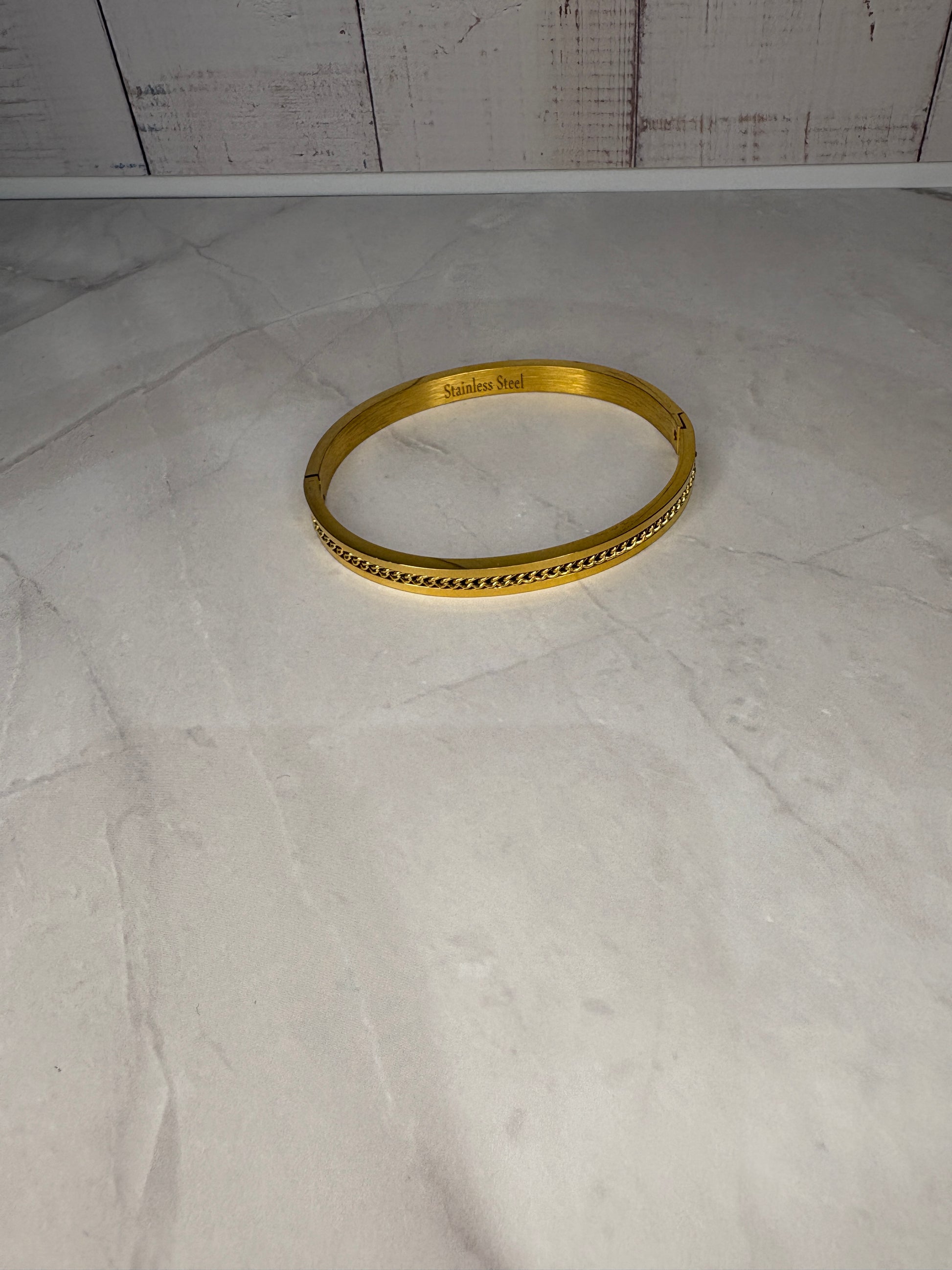 Elegant and timeless, this gold bangle features a delicate braided design for added texture and charm. Lightweight, tarnish-resistant, and perfect for everyday wear.