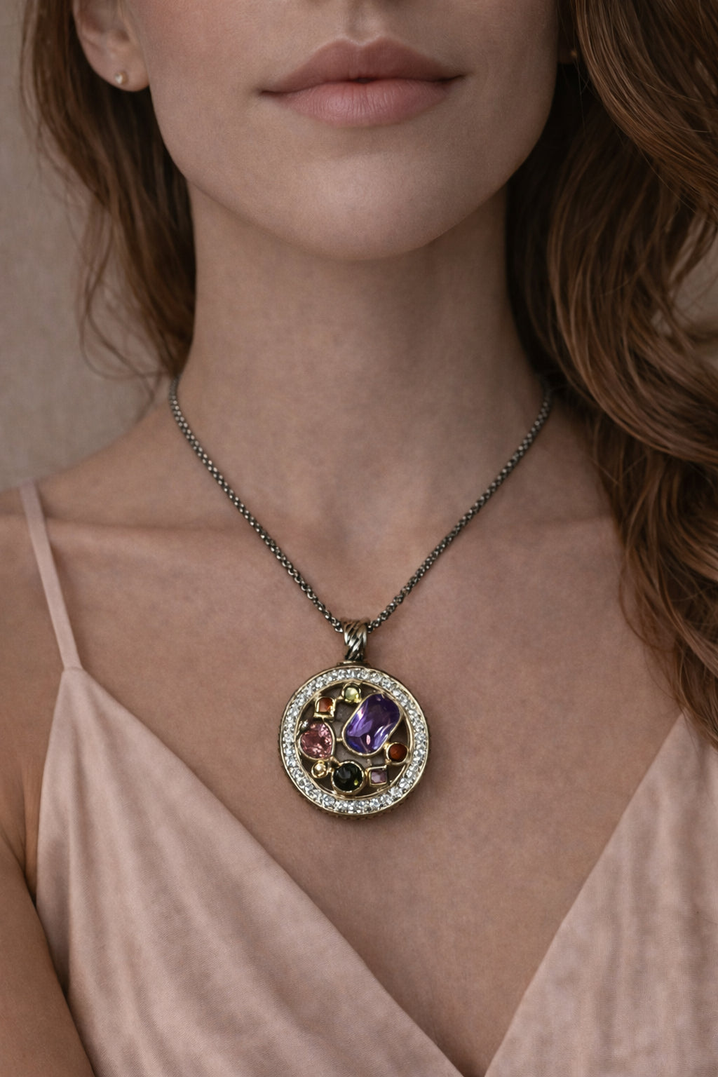 Elegant and eye catching, this round pendant necklace features a refined two tone design that blends warm and cool metal tones with luminous detail. The circular pendant is adorned with sparkling zirconia stones, creating depth, color, and a sophisticated focal point.